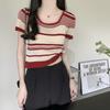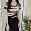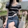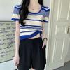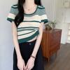 Fashion Knit Large Round Neck Striped Summer Design Sense Short Short-sleeved Tops Casual Summer Essential Comfort and Style Slim Fit Pullovers Tees