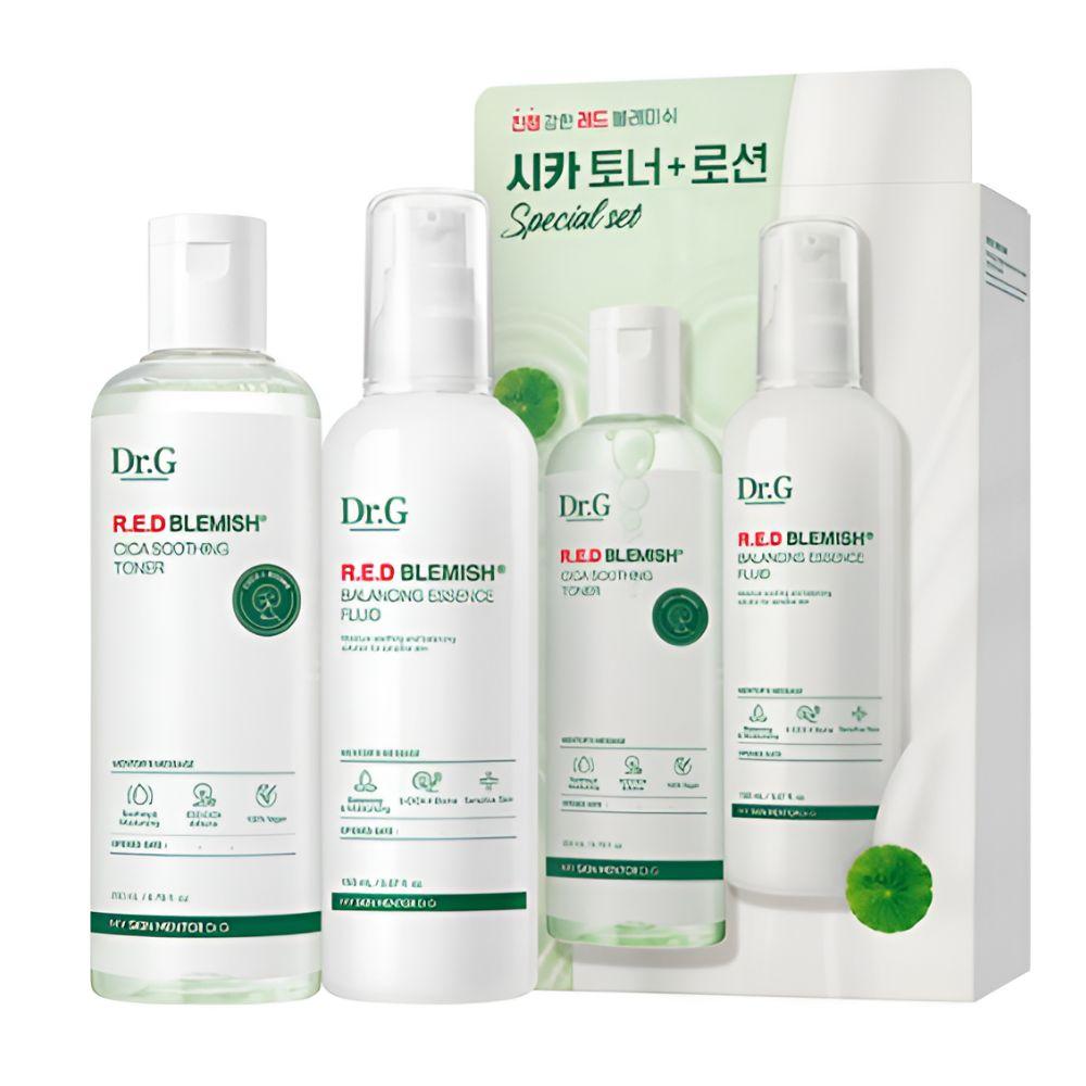 Dr.G Red Blemish Cica Toner & Lotion Set is a soothing skincare duo specially designed for sensitive and blemish-prone skin. Enriched with Centella Asiatica (Cica) ingredients, it helps calm irritation, reduce redness, and strengthen the skin barrier. The toner delivers refreshing hydration and prepares the skin, while the lotion locks in moisture for soft and balanced skin. Ideal for daily skincare routines that focus on calming and hydrating sensitive skin.