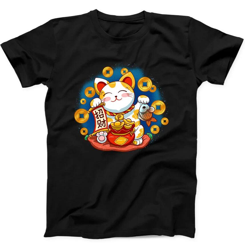 Maneki Neko Smiling Face Lucky Cat Funny Gift Tee Black T Shirt 49