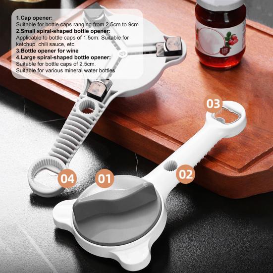 This versatile can opener combines a bottle opener, small bottle opener, and an adjustable rotatable winding mechanism to tackle various lid sizes with ease. Its flexible design clamps covers tightly, ensuring stable and safe removal without slipping or damage.
