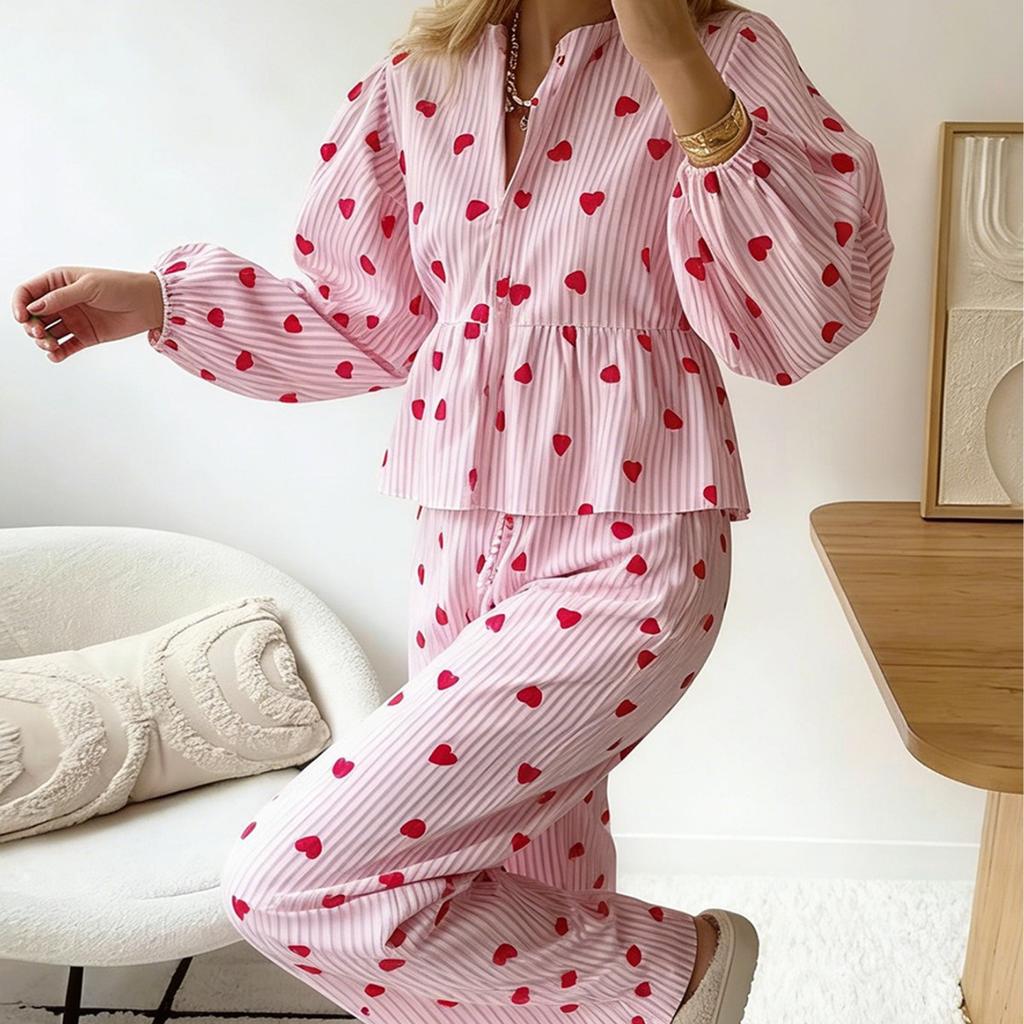 Spring Autumn Home Sleepwear Set - Silk Breathable Striped Heart Pattern Home Clothing