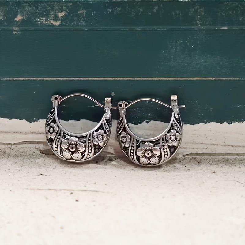 Vintage Bohemian Hoop Earrings, Silver Plated Zinc Alloy Floral Design, Distinctive Women's Dangle Jewelry Gift