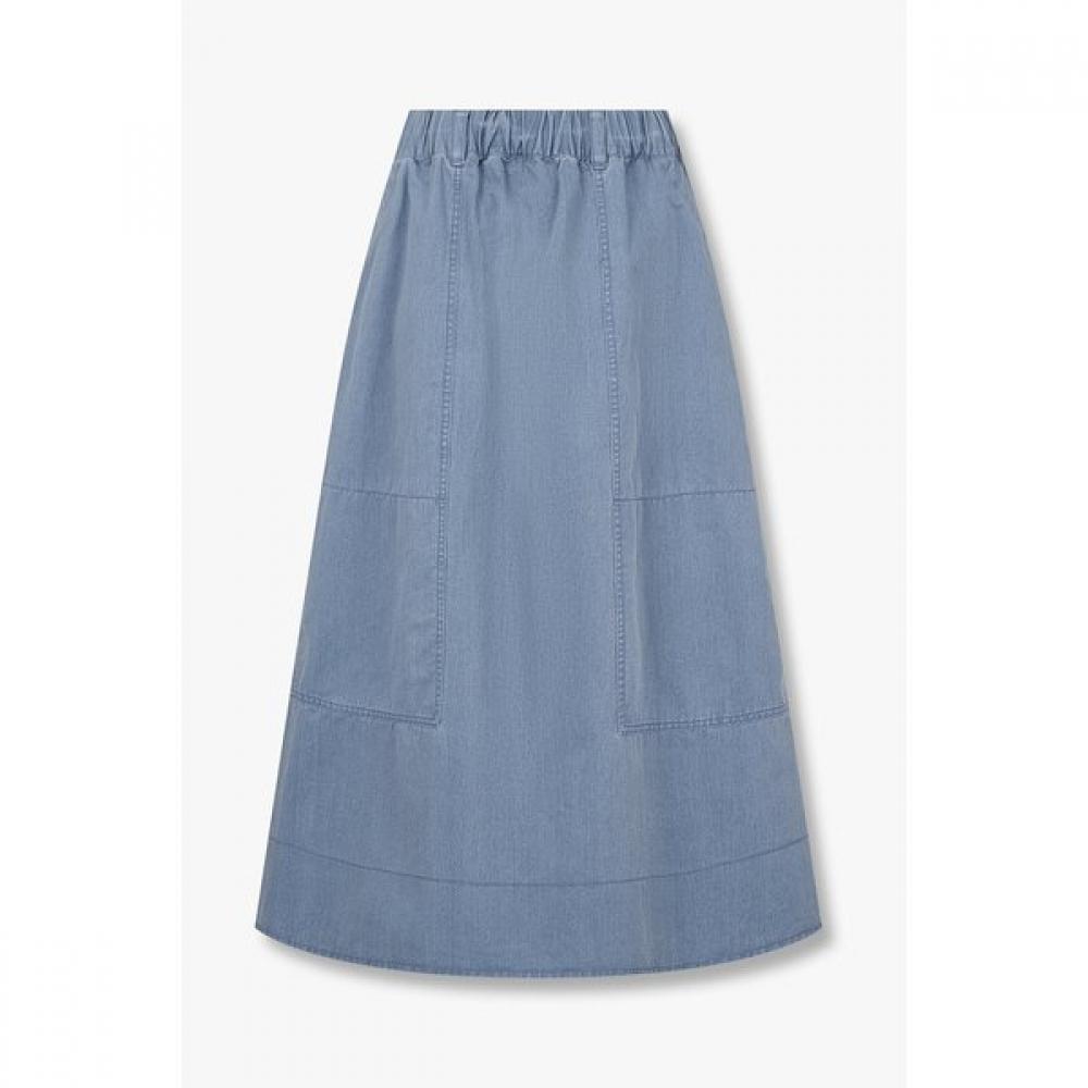 The Pigment Banding Skirt is a casual piece that features a 100% cotton material with pigment washing, creating a natural color and vintage texture that is appealing. The fully banded waist provides a comfortable fit while the loose silhouette gently covers the body shape. It's suitable for a wide range of styling from daily looks to natural casual wear.