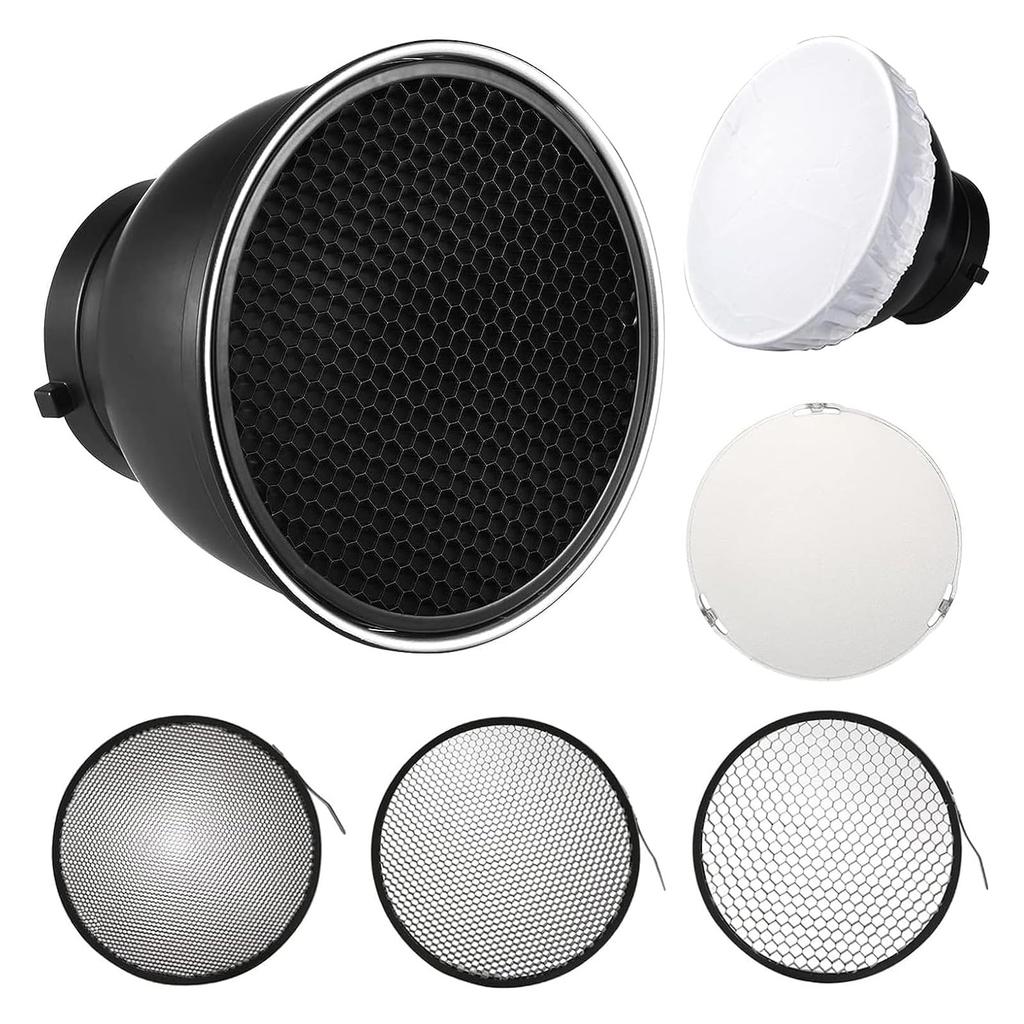 SOONPHO Standard Reflector Set with and Includes 3 Honeycomb White Soft Glass Diffuser Lamp Shade and Bowens Mount Strobe 7-inch (18cm) 20°, 40°, 60°