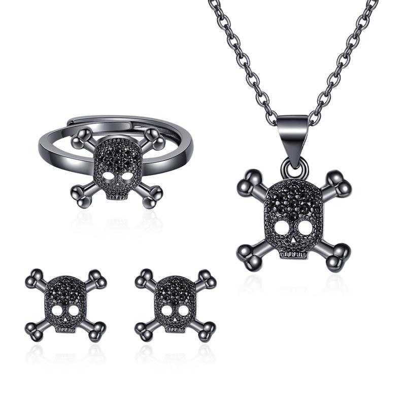 European & American Full Diamond Skull Necklace Set: Women's Halloween Retro Punk Earrings & Ring