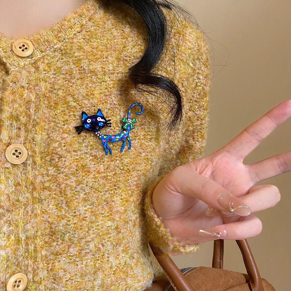 Retro Vintage Enamel Brooch Rhinestone Corsage Ornament Elegant Dripping Oil Cat Brooch for Gift