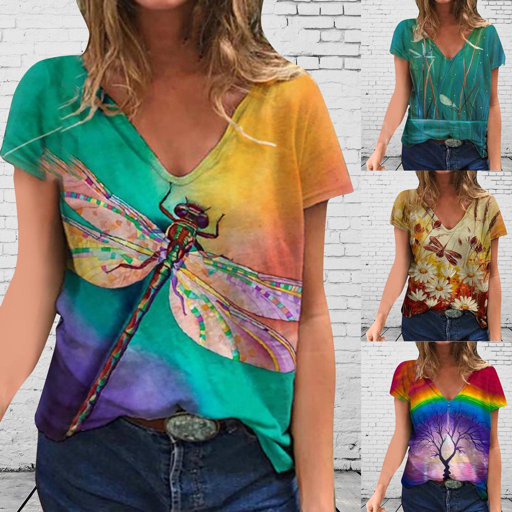 Plus Size Women Short Sleeve Printed V-Neck Tops Tee T-Shirt Blouse