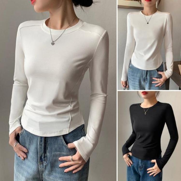 Soft Elastic Pullover Tops Women Long Sleeve Round Neck Slim Fit Base Shirt Solid Color Daily Wear Tops