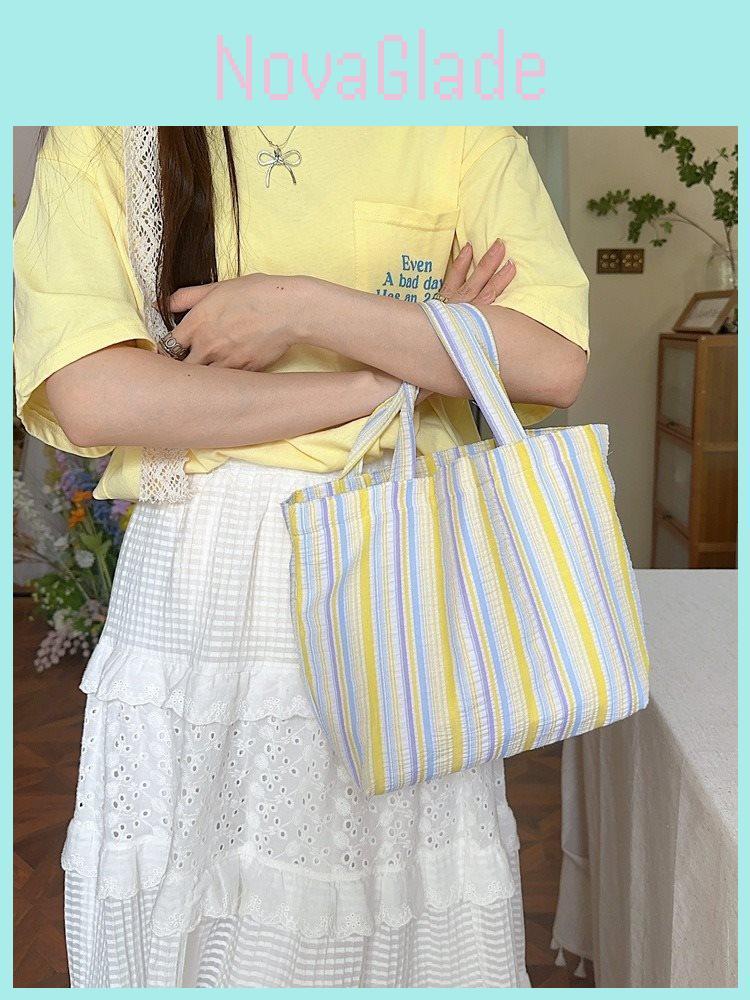 Trendy Design: Embrace the street fashion vibe with our stylish tote bag available in vibrant colorsyellow, pink, and blue stripes.