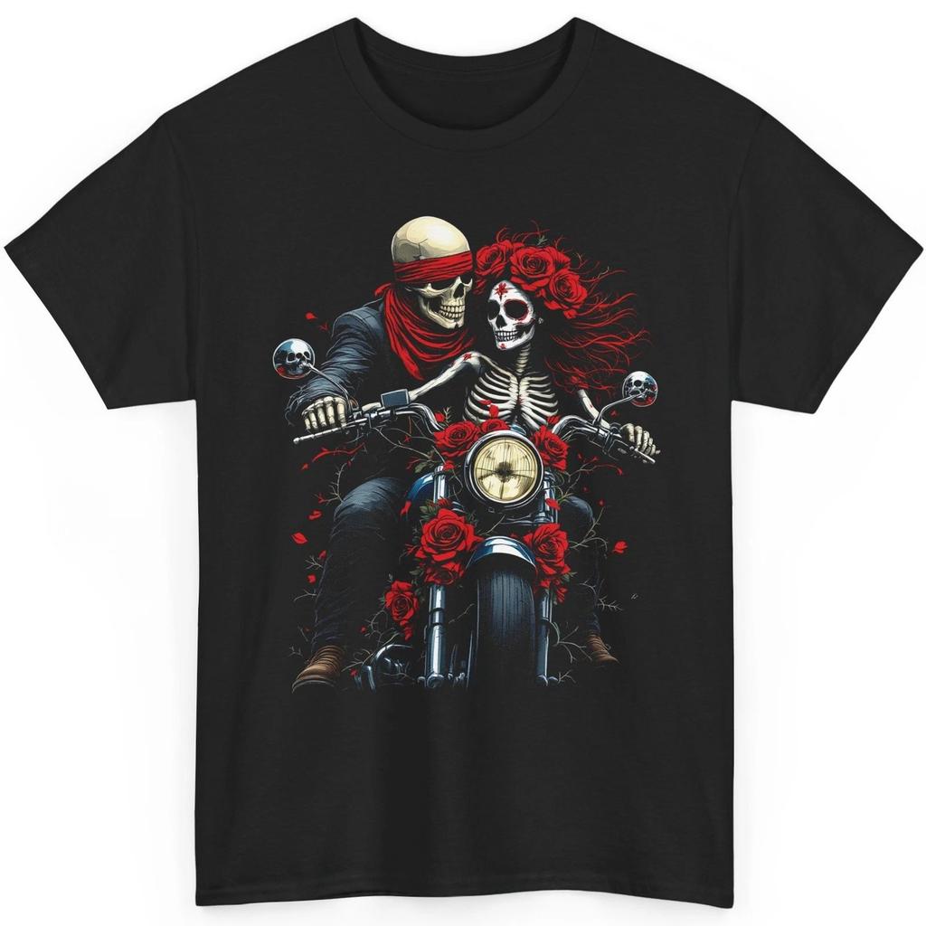Biker Skeleton Couple T Shirt Motorcycle Graphic Tee Gothic Roses Till Death Top