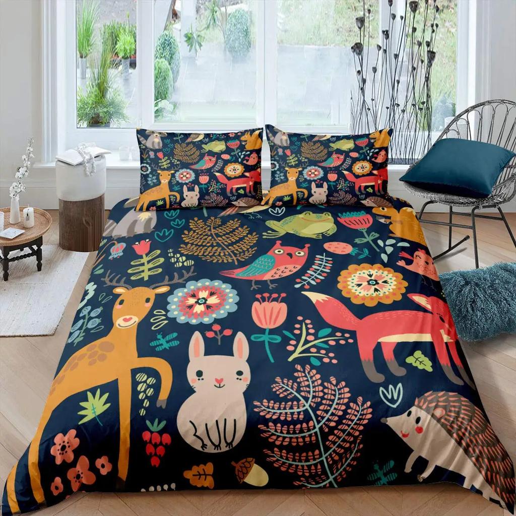 Comforter Cute Forest Animals Theme S King Size Fox Deer Rabbit Owl Hedgehog Flowers Comforter Set 2/3Pcs Bedding Set