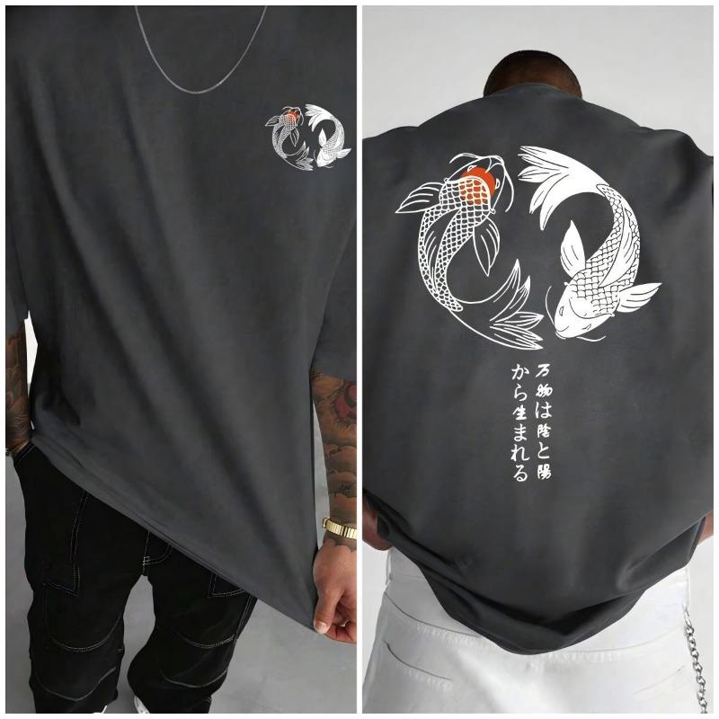 Japanese Koi Harajuku Illustration Pattern T-Shirts Men Summer Casual T Shirt Soft Fashion Short Sleeve Loose Cotton Sportswear