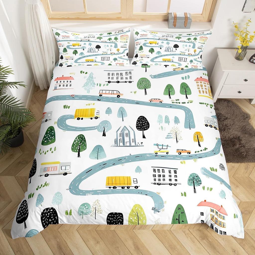 Comforter Cartoon Truck Twin City Landscape Bedding Set Hand Drawn Cartoon Vehicles City Map Railway Train Comforter