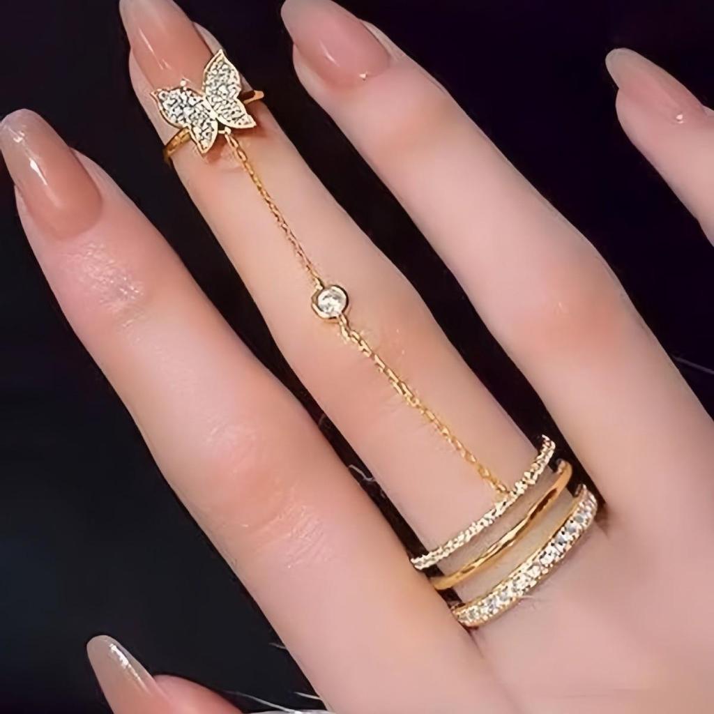 Butterfly Rhinestone Double-Finger Tassel Ring - Women's Unique Chain Design
