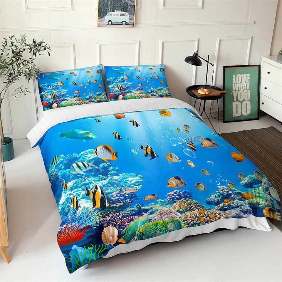 Comforter Ocean Blue Sea Fish 3D Printed Kids Bedding Set Queen King Nordic Ocean Landscape Soft Polyester Comforter
