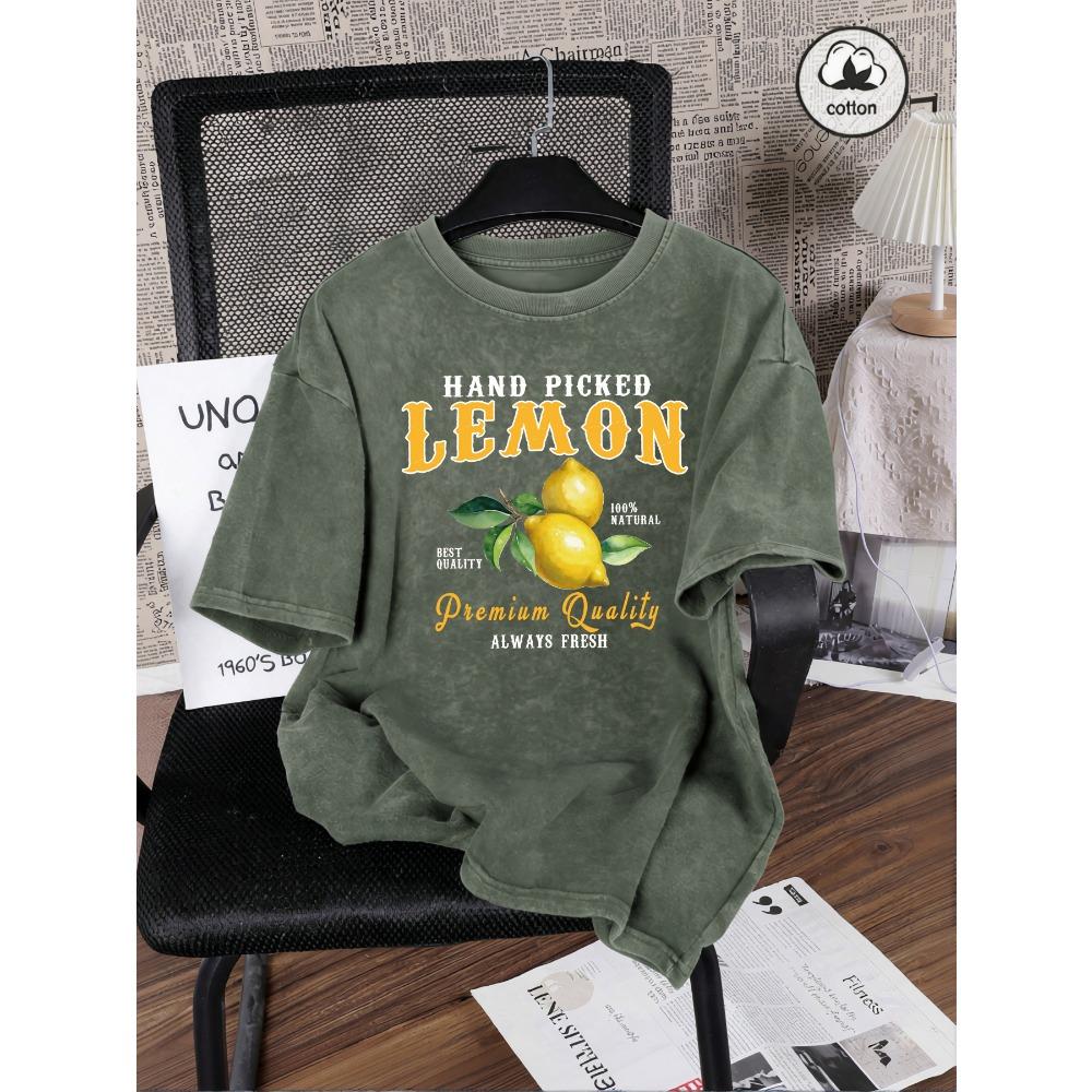 Hand Picked Lemon Always Fresh Print Washed T Shirt Women Cotton Clothes O-Neck Casual T-Shirt Loose Summer Top