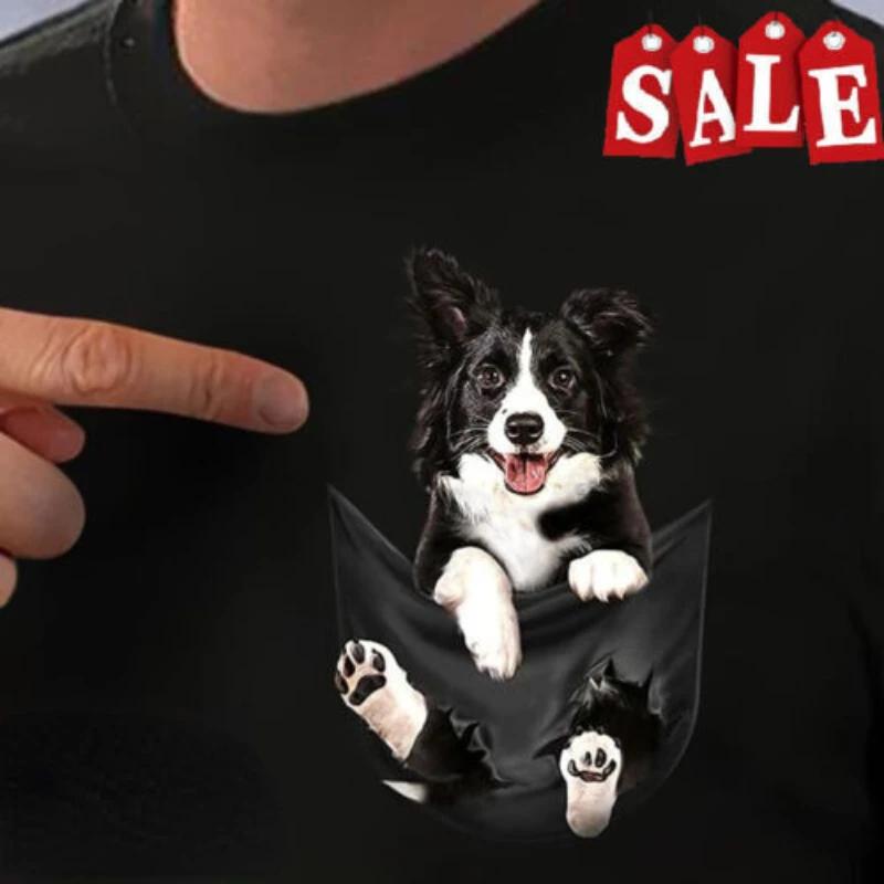 Border Collie In Pocket Cute Puppy Funny Dog Lovers Unisex TShirt 100 Cotton ONeck Summer Short Sleeve Casual Mens Tshirt
