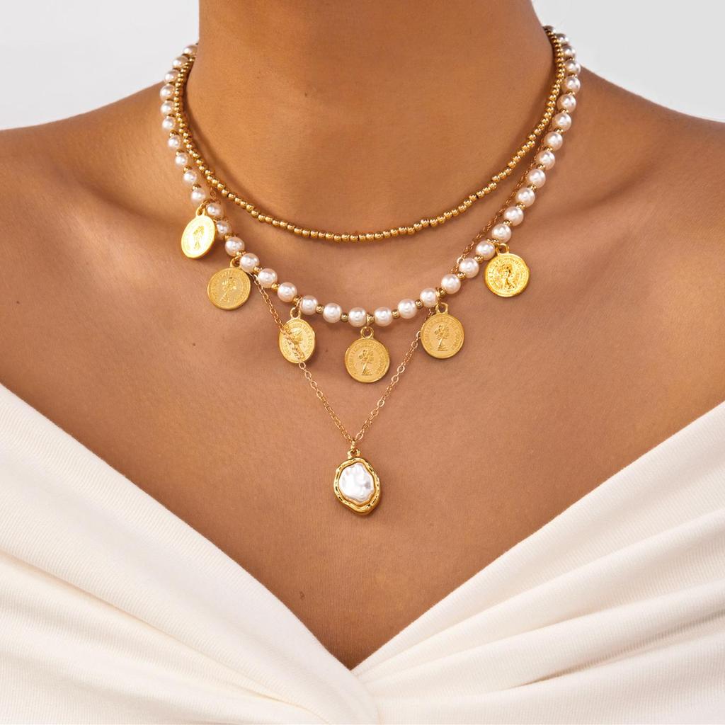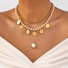 European & American Style Multi-layer Pearl Coin Necklace with Baroque Pendant and Clavicle Chain