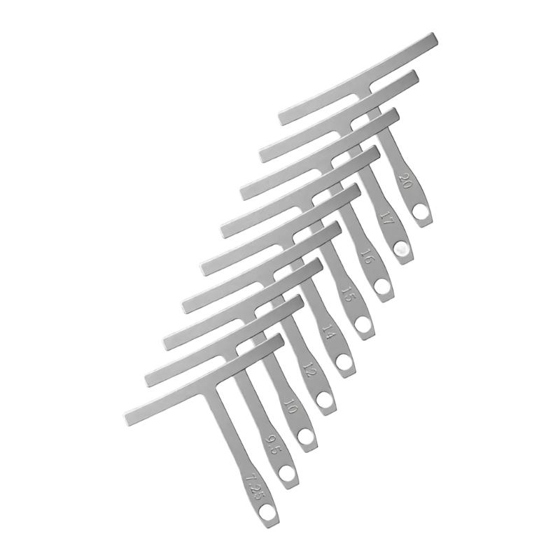 This fretboard gauge set includes 7.25", 9.5", 10", 12", 14", 15", 16", 17", and 20" measurements, covering most guitar types from 7.25" to modern compound and flat guitar fingerboards for comprehensive fretwork solution.