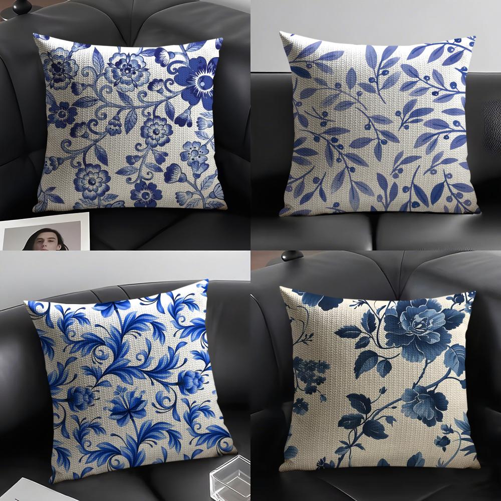 Blue Pattern Hot Cushion Cover Natural Linen Organic Fabric DoubleSided Printing Sofa Home Decor Gift Pillow Case