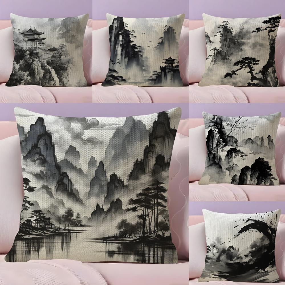 Ink Painting Chinese Style Cushion Cover Natural Linen Pillow Case DoubleSided Print Decorative Sofa Pillowcase Home Decor Gift