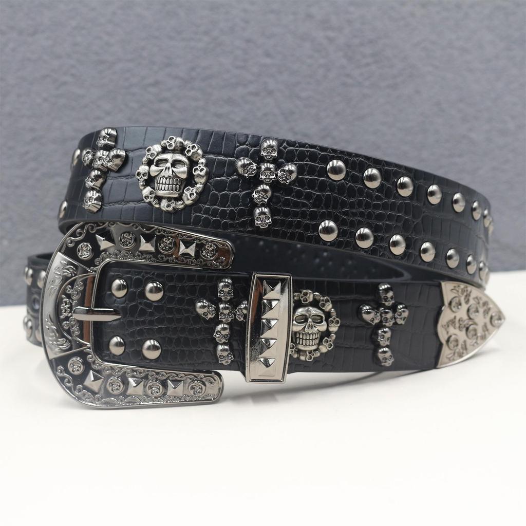 Crocodile Pattern Western Rivet Skull Punk Leather Belt, Unisex Y2K Style