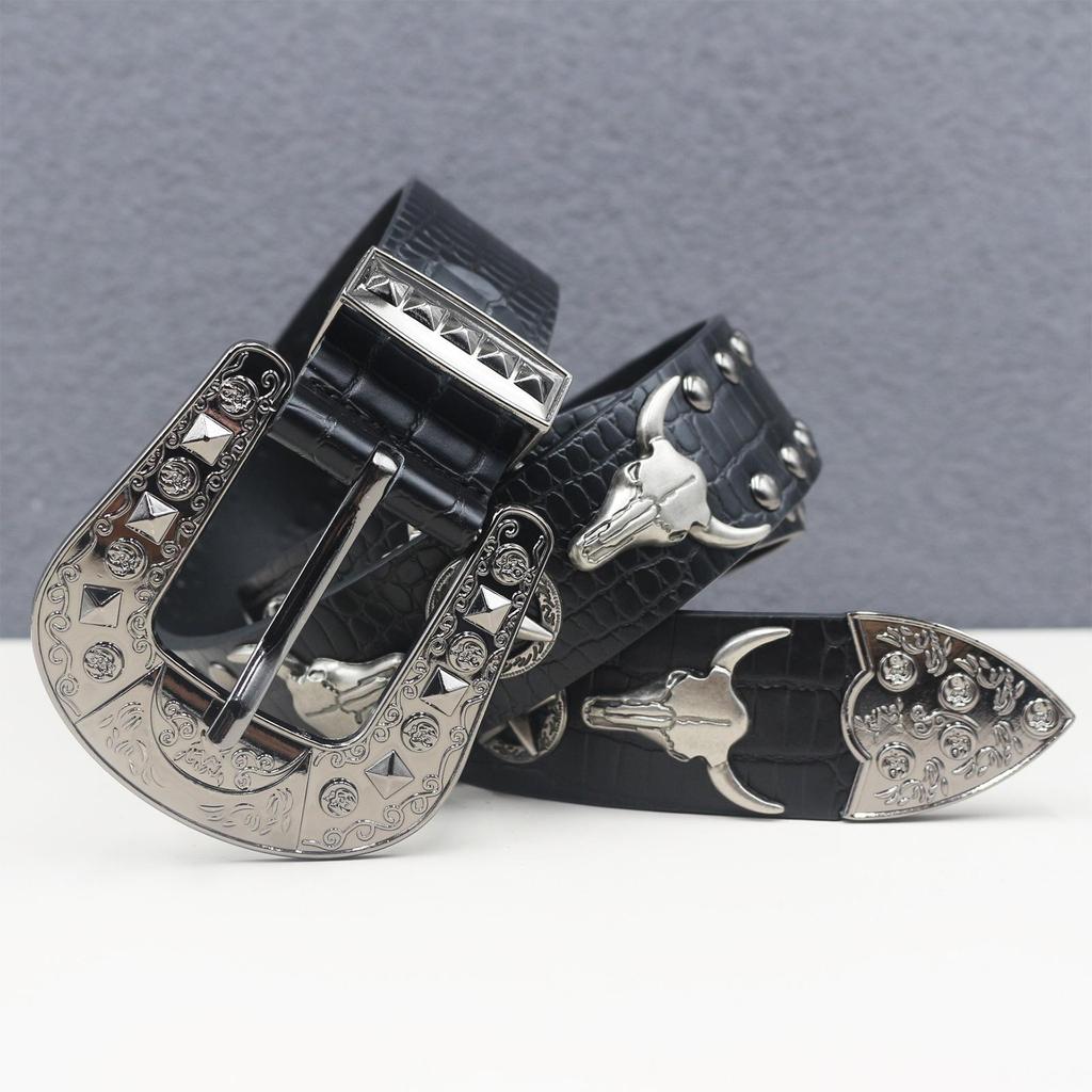 Crocodile Pattern Western Riveted Bull Head Leather Belt - Punk Y2K Unisex