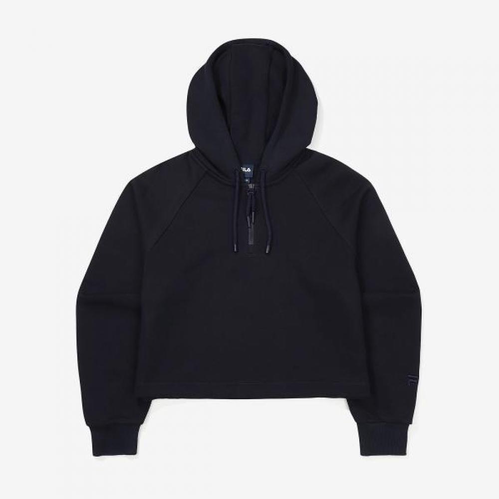 The FILA Half-Zip Hoodie is a women's t-shirt suitable for hiking and outdoor activities. It features a half-zip design at the neck and a hood, made with stretchable fabric for excellent comfort. The color is Black.