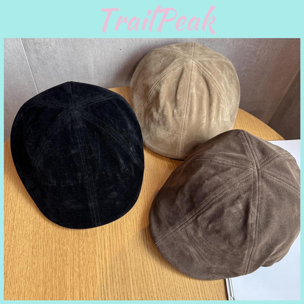 This suede beret cap features a rounded crown with a short brim and sunshade function, providing effective protection from sunlight. Made of soft suede velvet with material content, Designed for fall and winter, it supports outdoor activities like city walks or casual outings. Wipe clean with a damp cloth to maintain its appearance.