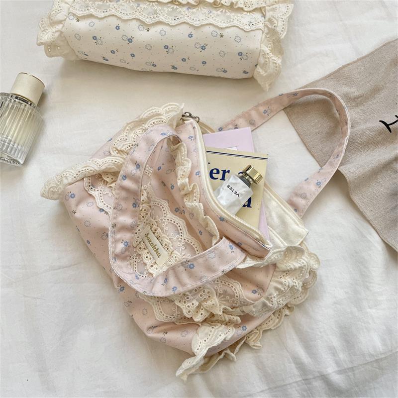 Cute Sweet Lace Floral Handbag Large Capacity Casual Commuting Tote Bag Portable Storage Bag Girl Heart Clutch Cosmetic Bag Gift