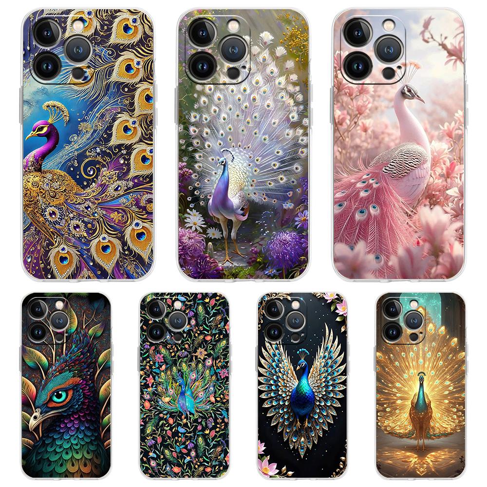 Soft TPU Transparent Phone Case Cover for iPhone 16 15 14 13 12 11 Pro Max XR 8 7 Plus XR Shell Animal Cute Peacock Pattern Bags