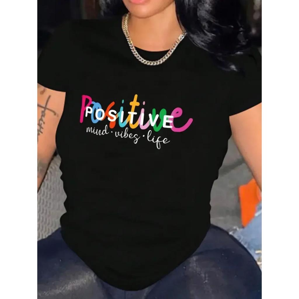 Neck Casual Top Women's Casual T-Shirt Creative O-Neck Positive Letter Print Sports T-shirt Fashion Sleeve Round