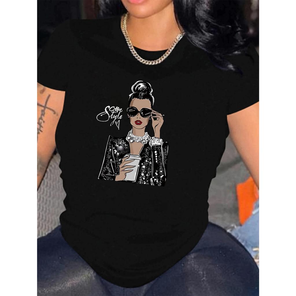 Portrait Print T-shirt Short Sleeve Crew Neck Casual Top for Summer & Spring Women's Clothing