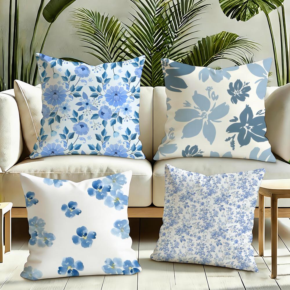 Elegant Blue Floral Cushion Cover Silky Short Plush Invisible Zipper Dustproof Sofa Pillow Case for Home Decor
