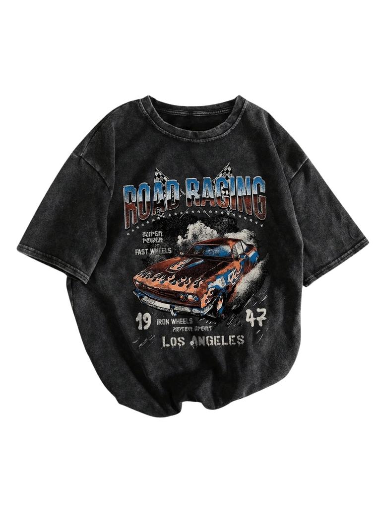 Washed Vintage Road Racing Car Print 100% Cotton Oversized Short Sleeve T-shirt