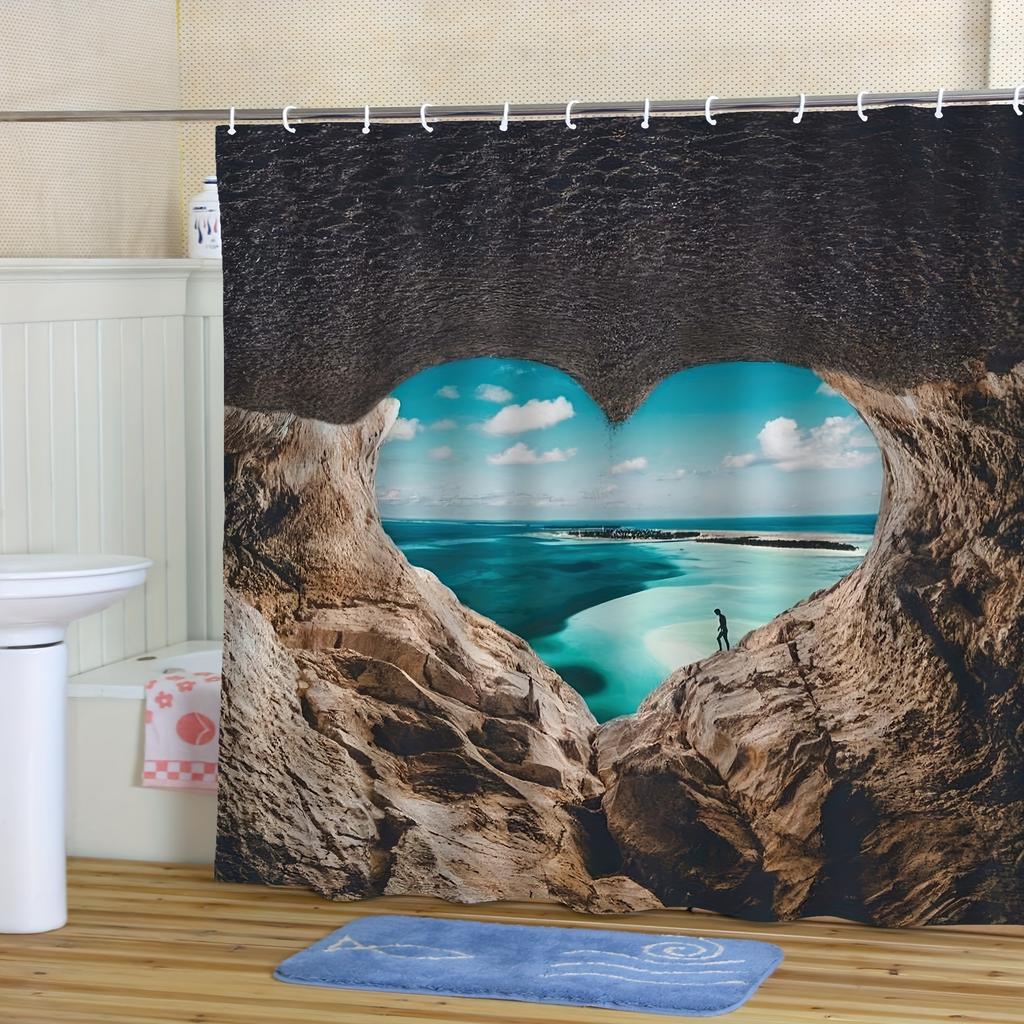 Beach Heart Shower Curtain - Polyester, Machine Washable, Blue & Turquoise, Hooks Included, Ideal for Beach Fans