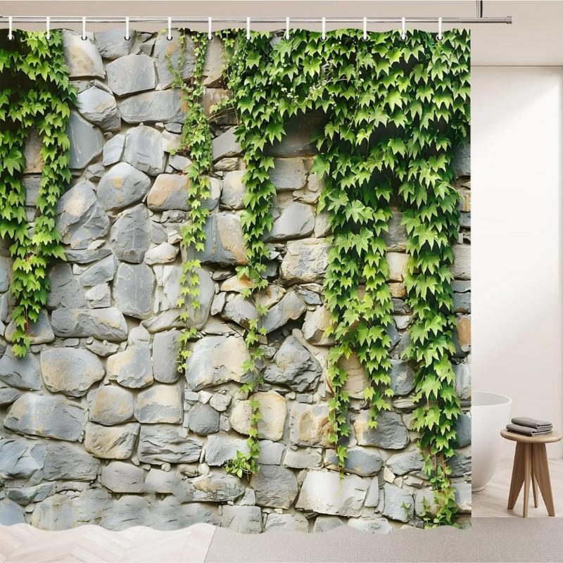 Stone Wall Shower Curtains Spring Green Leaves Vine Plant Rustic Farm House Polyester Fabric Bathroom Decor Bath Curtain Sets