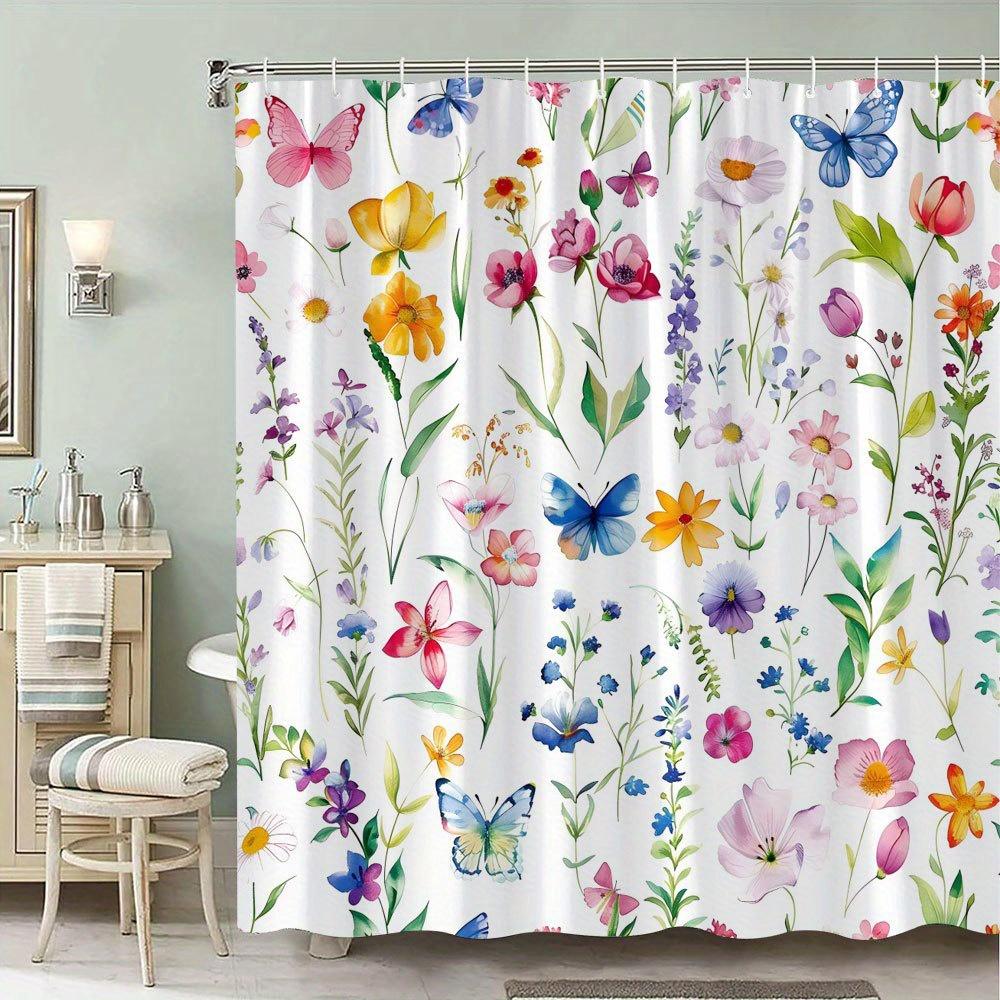 1 Piece Floral Butterfly Shower Curtain, Colorful Roses, Daisies and Lilies with Butterflies, Polyester Fabric, with Hook