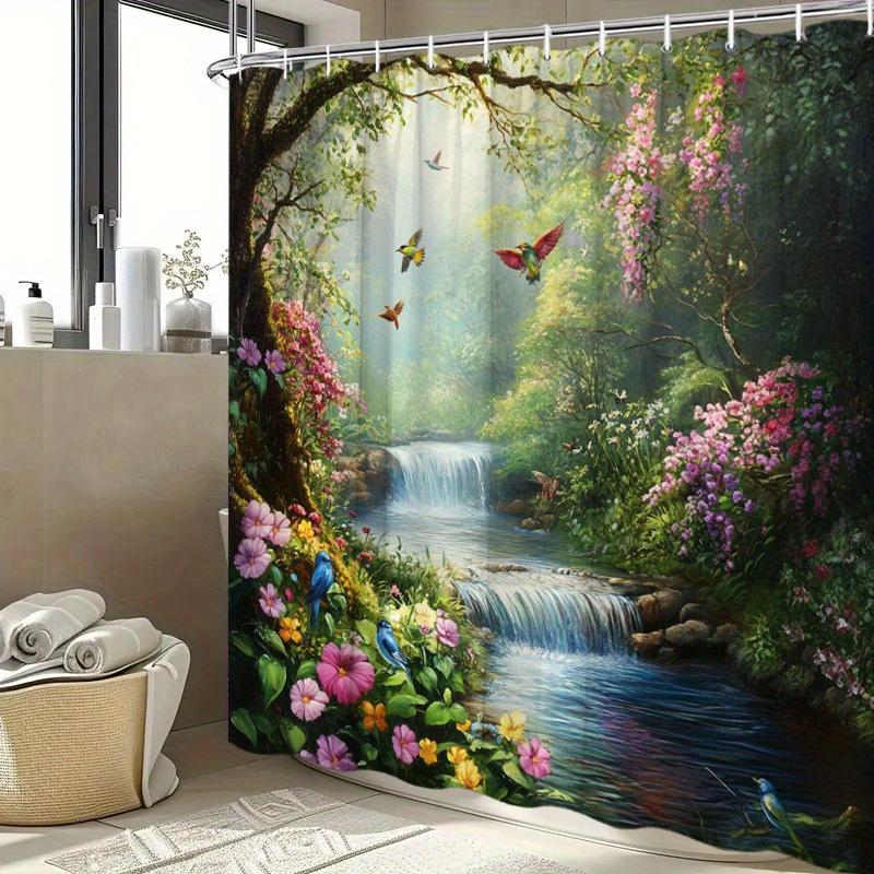 1pc Lush Forest Stream Shower Curtain - Waterfall, Birds & Flowers, 70.8x70.8", Polyester, 12 Hooks, Washable