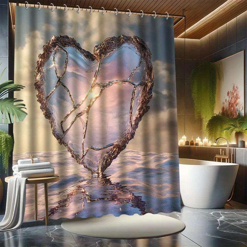 Heart Printed Shower Curtain Set - Ocean Background, 12 Hooks, Waterproof Polyester, Bathtub Partition, Modern Bathroom Decor