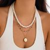 Fashion Imitation Pearl Crystal Chain Necklace Female, Retro Metal Moon Tag Stacked Pendant