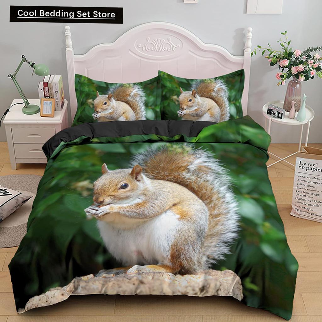 3D Squirrel King Queen Duvet Cover Soft Wildlife Green Leaves Bedding Set for Kids Teens Adults 2 3pcs
