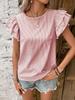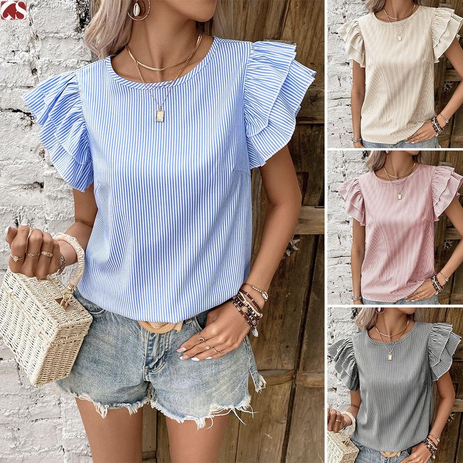 Women's Summer New Style Round Neck Striped Ruffles Sleeve Shirt Top