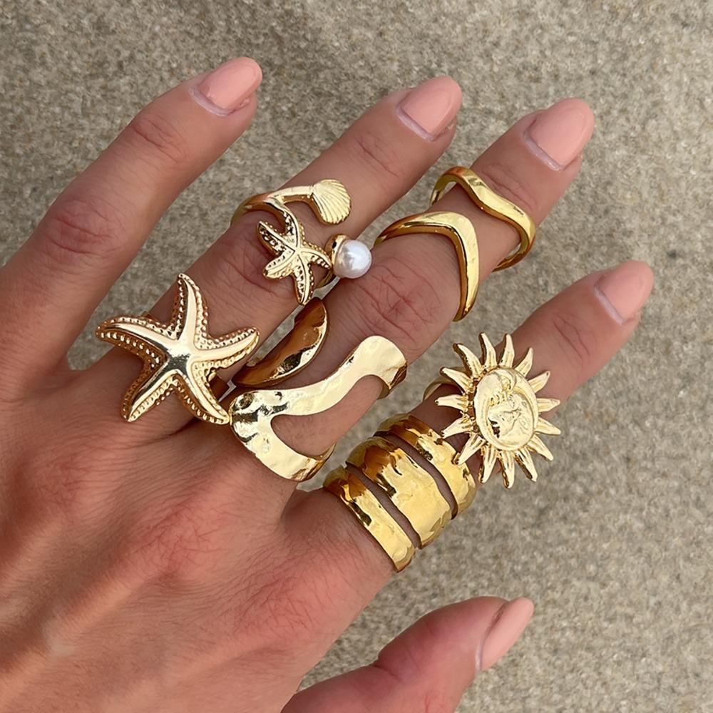 6pcs Set Exaggerated Personality Summer Starfish Shells Sun Flower Rings for Women Retro Irregular Charm Finger Jewelry Set Gift