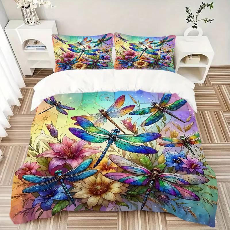 3pcs Colorful Dragonflies Printed Bedding Set, Soft and Comfortable Quilt Cover for Bedroom, Guest Room (1 Duvet Cover + 2 Pillowcases
