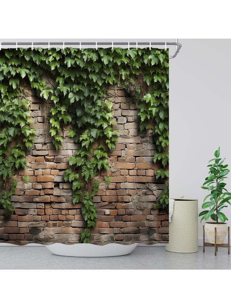 Green Leaves Shower Curtain Brick Wall Garden Landscape Nature Plant Rustic Country Red Brown Stone Wall Creative Bathroom Decor