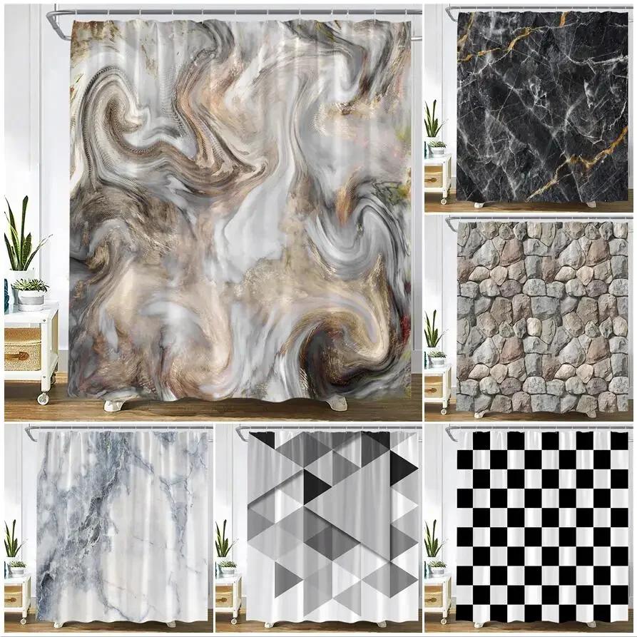 Abstract Marble Shower Curtains Retro Stone Wall Creative Black and White Plaid Geometric Bath Curtain Fabric Bathroom Decor Set