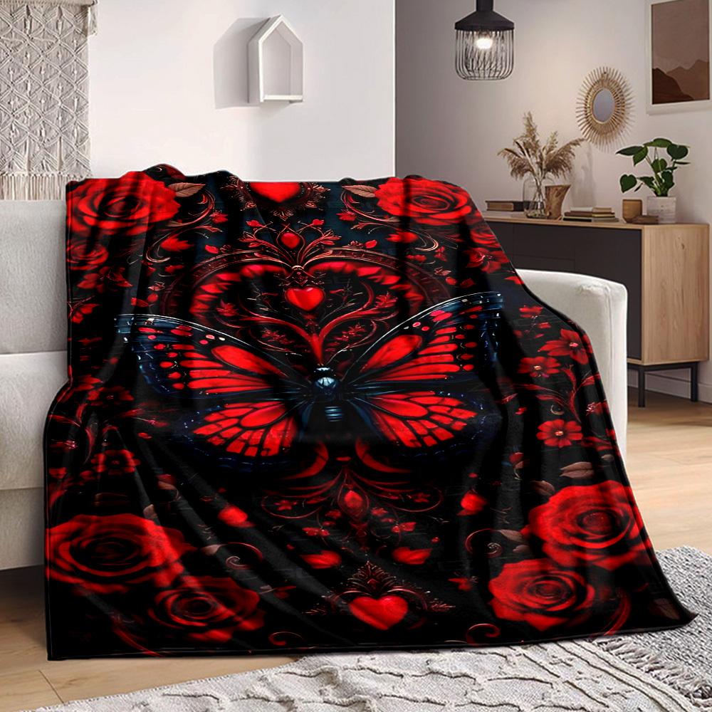 1pc Red Butterfly Roses Blanket Lightweight Flannel Blanket Throw Blanket For Sofa, Bed, Travel, Camping, Livingroom, Office, Couch, Chair, And Bed Yy