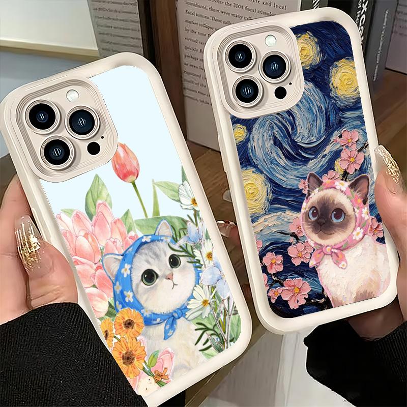 Phone Case for iPhone 17 Air 16E 15 16 Pro Max Cute Floral Headscarf Kitten Cover 14 Plus 13 12 Mini Soft Shell Silicone Fundas