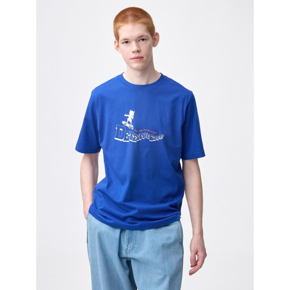The Graphic T Detective Conan by GU by Uniqlo is a collaboration product with the widely loved "Detective Conan," themed around "the three KEYS holding the key to the story." This product is particularly characterized by focusing on KEY WORD (impressive lines) and KEY PERSON (important figures) for MENS styles. The silhouette of Conan riding a turbo-engine skateboard is graphicly represented along with the phrase, "Ah, believe in me... 100% success!!".